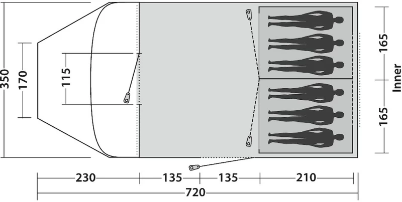 Je loopt deze tent heel eenvoudig binnen door de grote D-vormige deur óf de zijdeur. Je kunt daarnaast de tunneltent naar eigen wens indelen. Vind je het gezellig om met zijn allen in één ruimte te slapen? Of wil je juist liever twee gescheiden slaapplekken? Het is beide mogelijk, dankzij de scheidingswand in de tent.